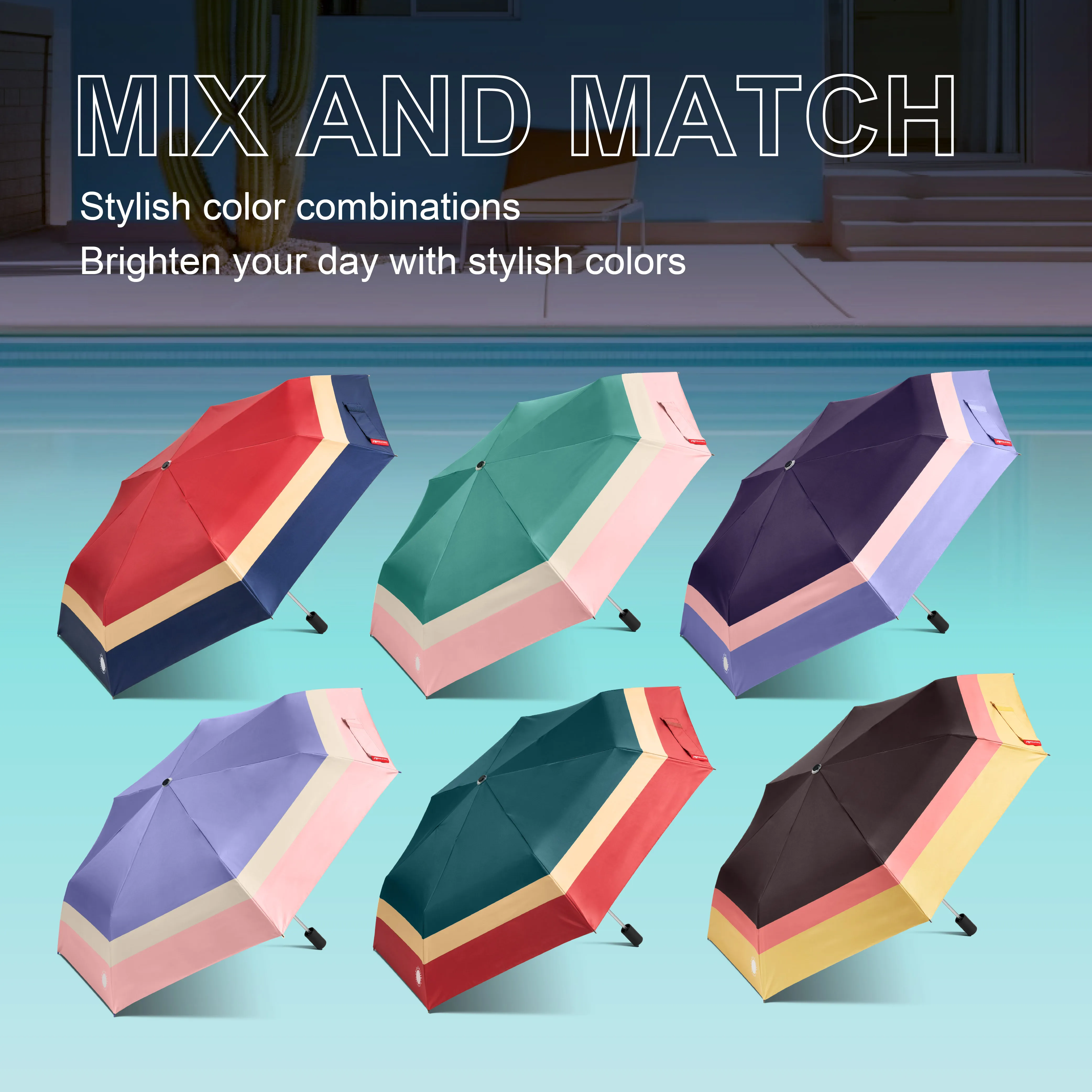 This manual folding umbrella isn’t just about shielding you from the sun — it’s about doing it in style. Each canopy features a triple color block design, combining three lively, energetic colors that stand out in a crowd. With UPF50+ protection, it blocks over 98% of harmful UV rays, keeping you cool and safe under the sun.
