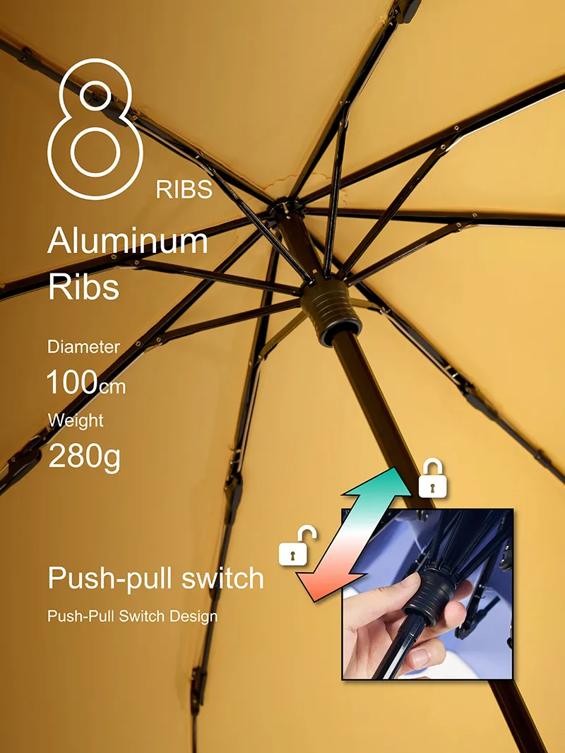 Aluminium 8-rib frame | ABS handle | Pinch-proof push-pull runner