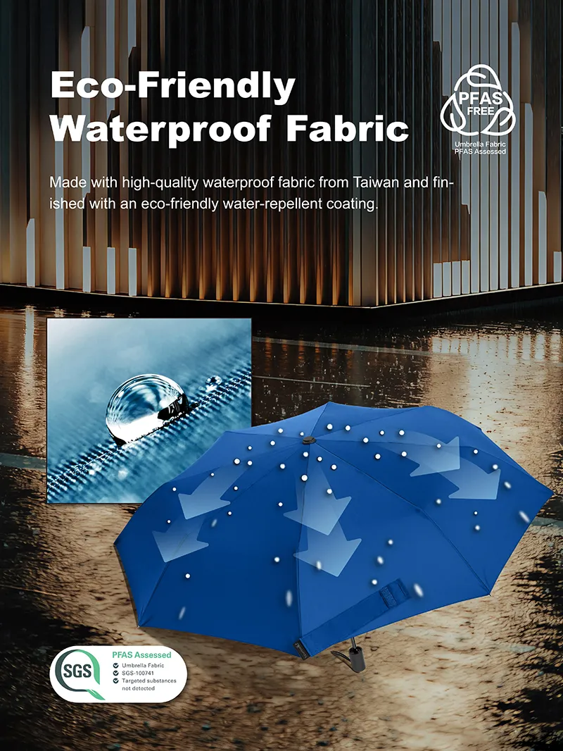 The water-repellent treatment on this umbrella is PFAS-free and carries PFAS certification to back it up. PFAS — per- and polyfluoroalkyl substances — are the chemical compounds used in traditional DWR coatings on most umbrellas and outdoor textiles. They are effective at repelling water, but they don't break down in the environment or in the human body, which is why they've been the subject of increasing regulatory scrutiny across Europe and North America. The PFAS-free coating on this umbrella achieves the same water-beading performance through a fluorine-free formulation: rain hits the 210T Pongee canopy and rolls off rather than soaking in, without relying on chemistry that accumulates in ecosystems. For buyers in markets where PFAS restrictions are tightening, this certification simplifies both messaging and compliance.