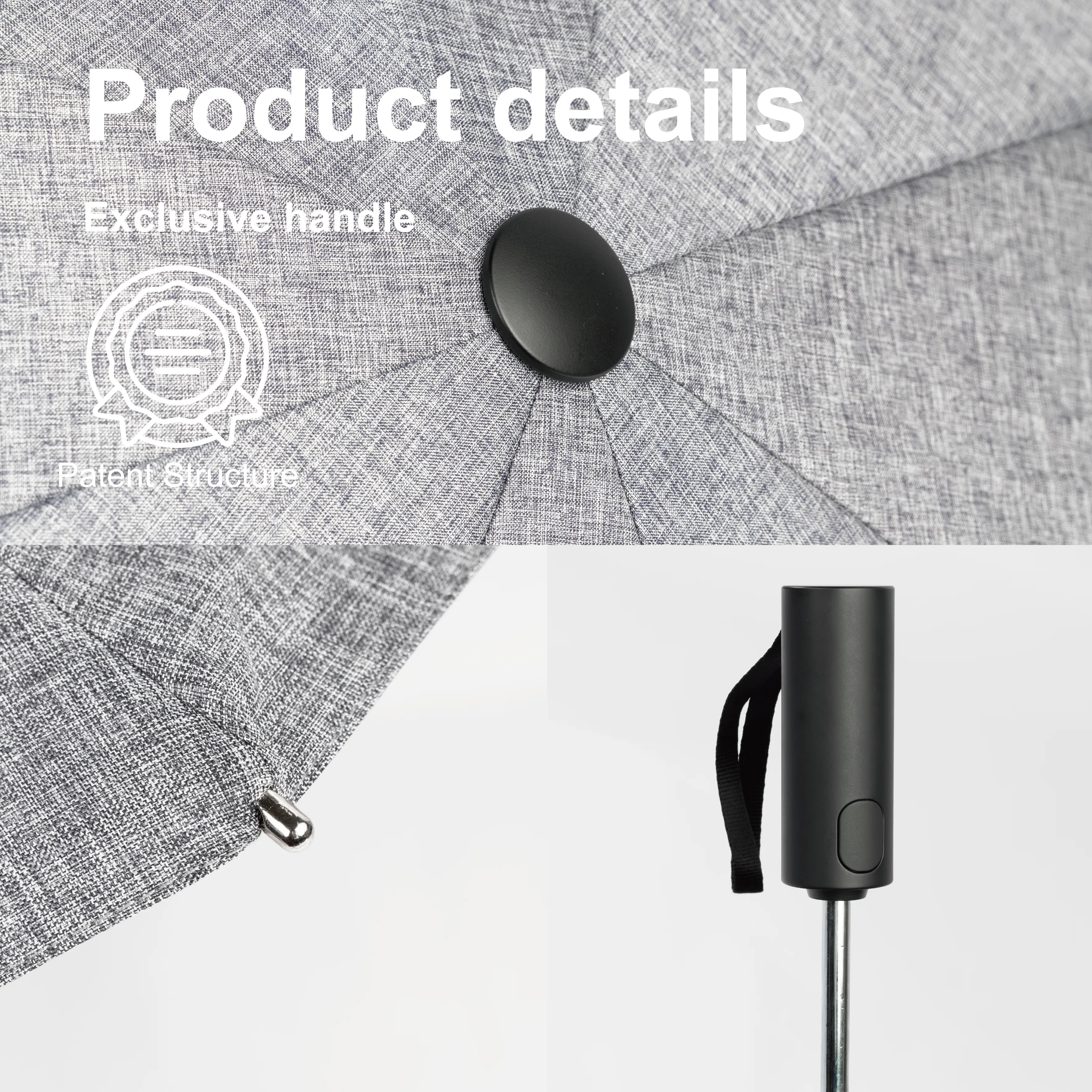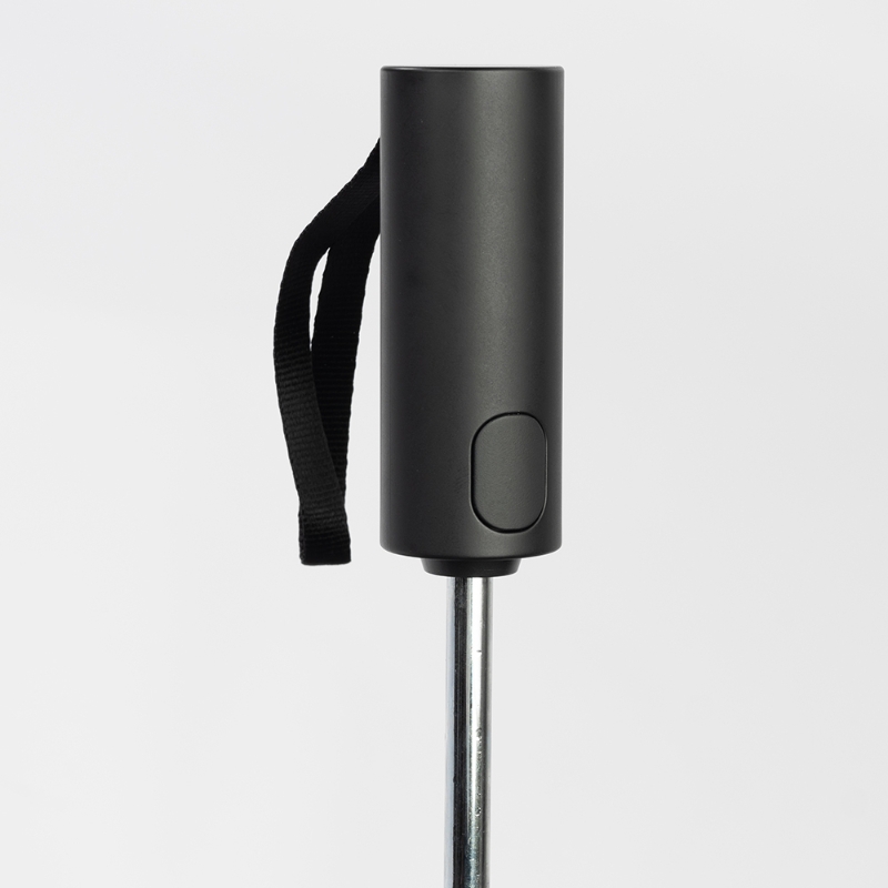 Most folding umbrella handles are shared moulds — the same ABS form used across dozens of SKUs from multiple factories, slightly adjusted by colour. This umbrella uses a private-mould ergonomic handle developed specifically for this model. The distinction matters in two ways. First, the grip geometry is shaped around how a hand actually holds an umbrella — the curve, the contact points, the thumb rest — rather than around what's cheapest to produce. After five minutes of holding both, the difference is apparent. Second, for brand customisation, a private-mould handle means the shape itself is distinctive. When someone sees this umbrella, the handle profile doesn't read as generic. For lifestyle brands, fashion labels, and any brand that cares about the physical impression their products make, this is a meaningful difference from a standard off-the-shelf handle.