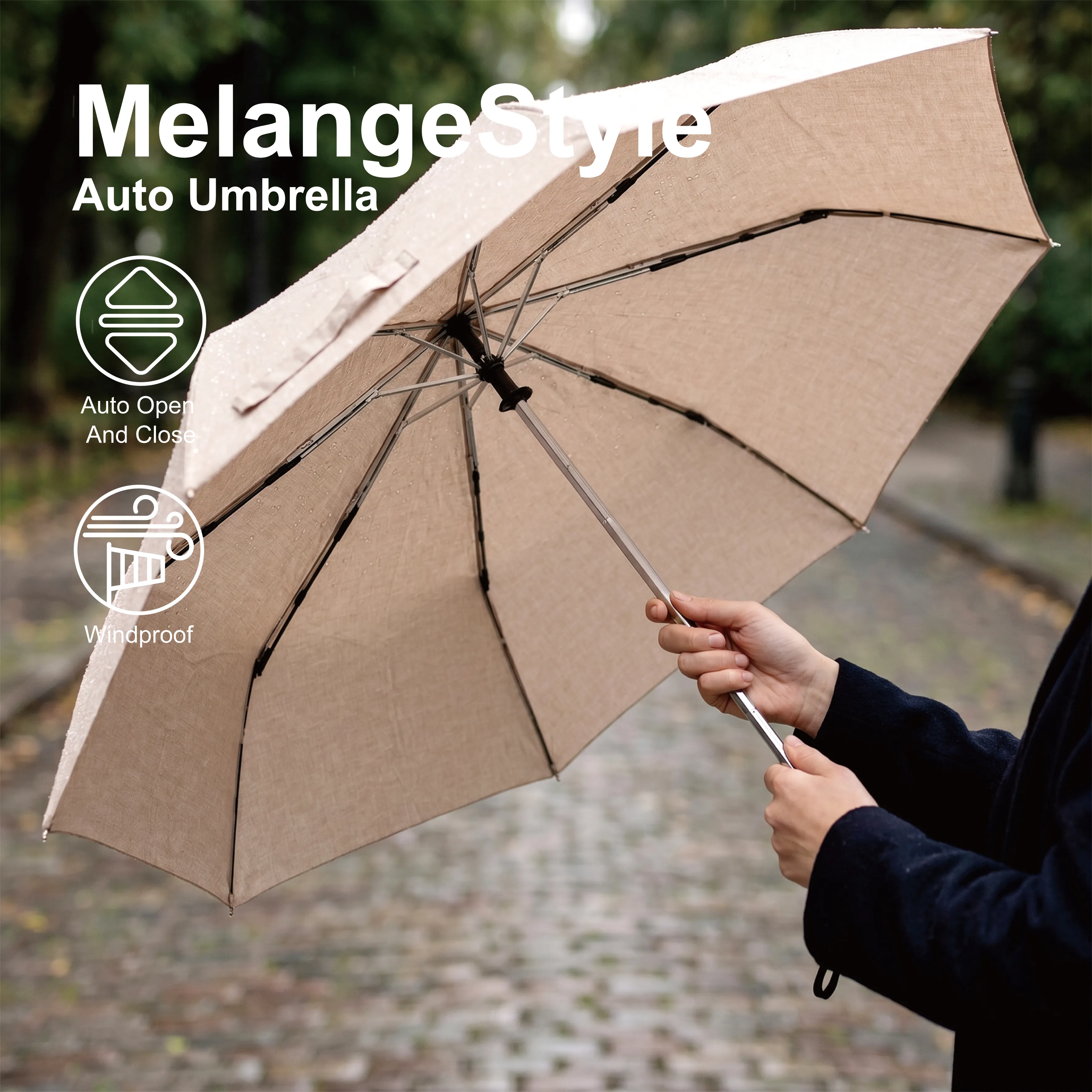 The design and material choices on this umbrella were made with brand-facing use in mind, and the result is a product that works across a wider range of applications than a standard promotional folding umbrella. For brand merchandise and lifestyle labels, the heathered fabric canopy and private-mould handle create a product that sits naturally alongside considered retail items rather than reading as a giveaway. For advertising and event campaigns, the 102cm canopy provides generous print real estate, and the AOC mechanism means the umbrella gets used rather than left in a bag because it's awkward to open. For personal gifting — weddings, corporate milestones, seasonal occasions — the premium material finish elevates the perceived value without requiring a premium price bracket. For corporate procurement, the SGS certification, PFAS-free credentials, and custom colour capability cover both compliance requirements and brand identity needs in a single product. Minimum order quantities and colour options are available on request.