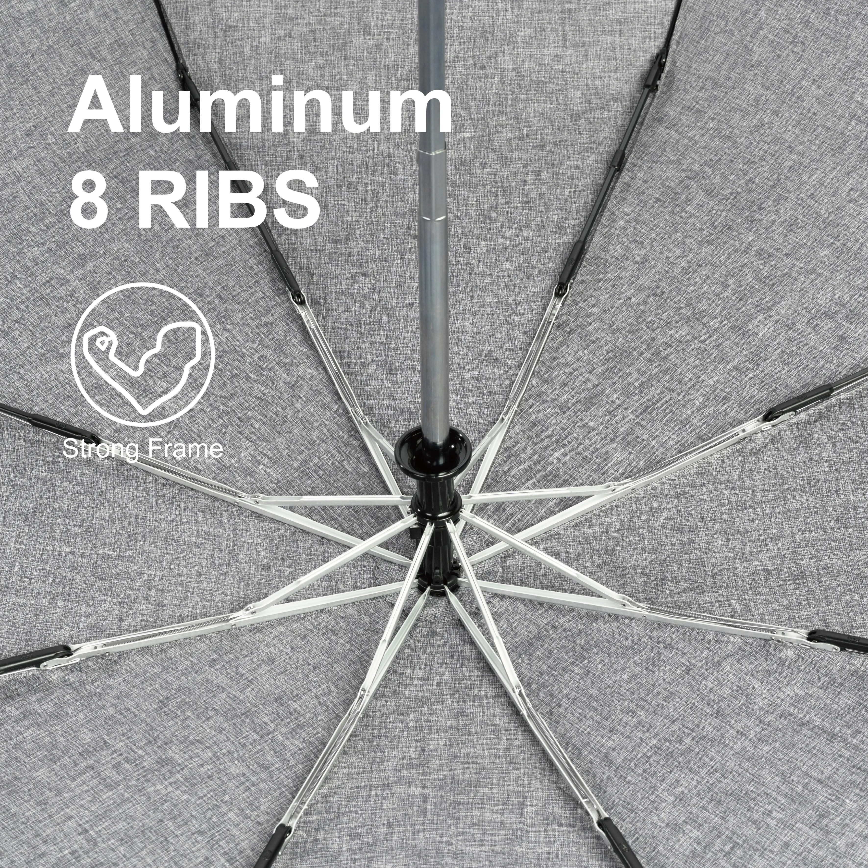 Aluminium + fibreglass 8-rib frame | Iron shaft | Custom-mould ergonomic ABS handle